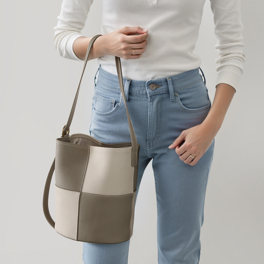 Discover the in fashion with our elegant two-tone bucket bag, crafted from luxurious first layer leather. This unique, high-quality shoulder and crossbody handbag offers a blend of sophistication and trendiness. Ideal for any occasion, elevate your style with a must-have accessory that combines practicality and chic design.