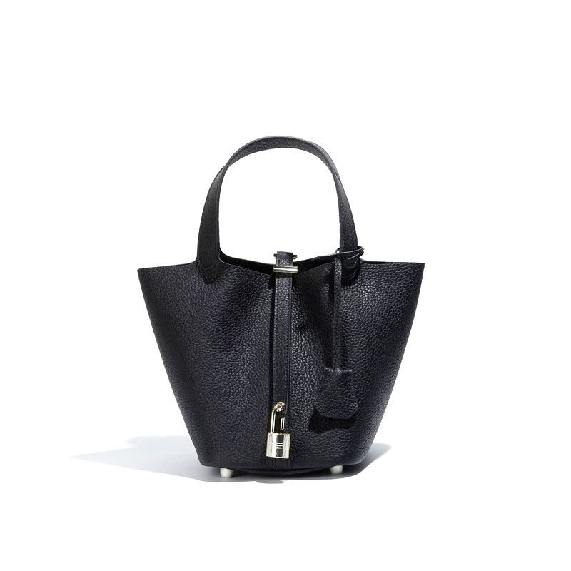 Genuine Leather Classic Fashion Tote Bag and Versatile Bucket Bag with Leather Lock Closure for Handheld or Shoulder Carry